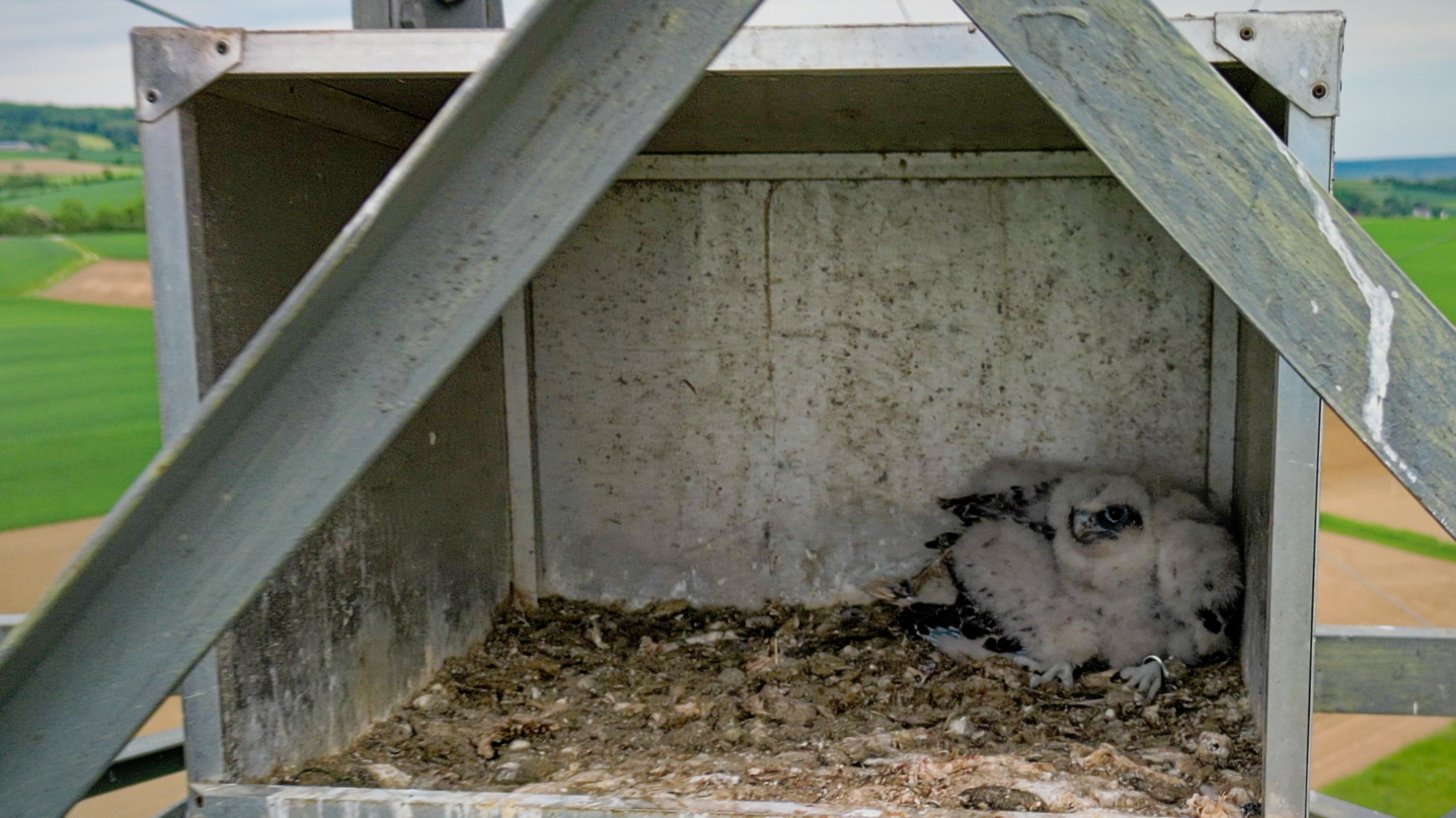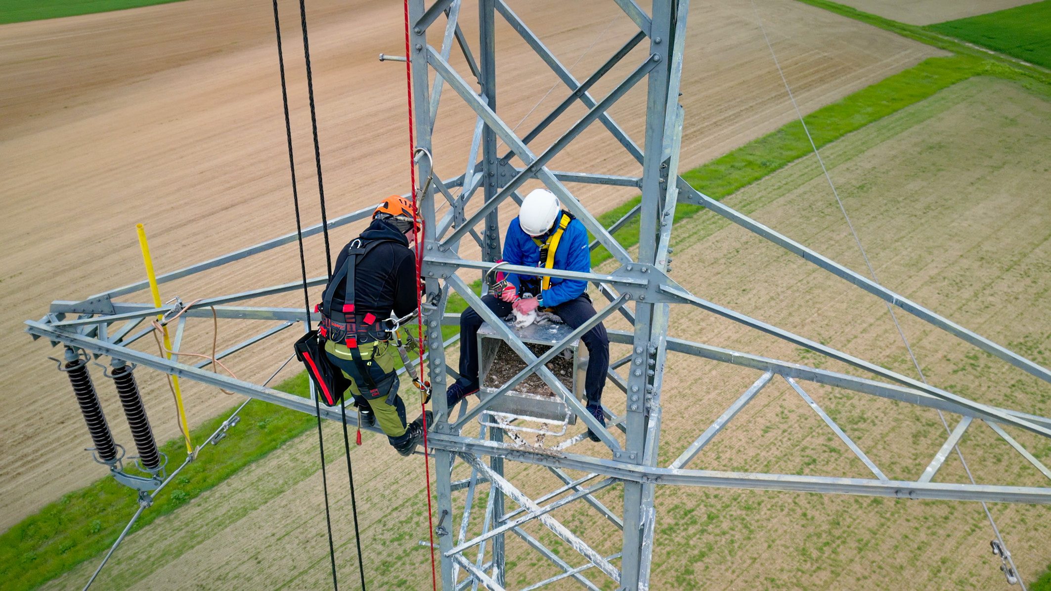 Um die Mitte März geschlüpften Jungtiere zu beringen, erklomm der Wildtierforscher nun gemeinsam mit Netz Niederösterreich Hochspannungsexperten Johannes Neuditschko den Brutkasten am Mast 43 entlang der 110 kV-Leitung zwischen Stockerau und Hollabrunn. Dafür muss die Leitung zuerst vom Systemoperator für Arbeiten freigeschalten werden. Erst nach der Überprüfung auf Spannungsfreiheit kann mit dem sicheren Aufstieg begonnen werden.